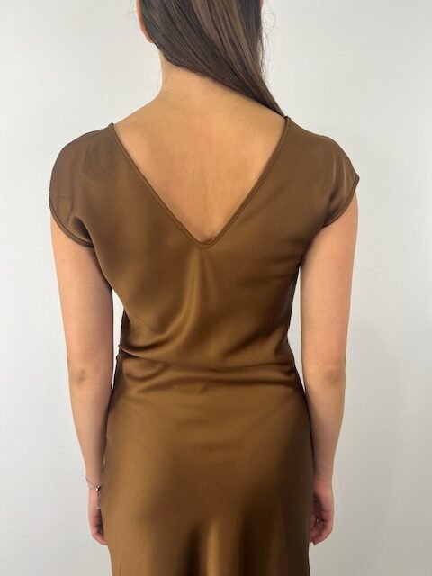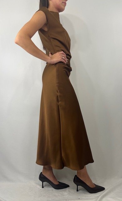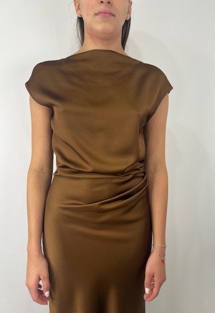 Abito lungo smanicato a tubino con collo morbido, elegante e minimal, ideale per un look sofisticato e senza tempo.