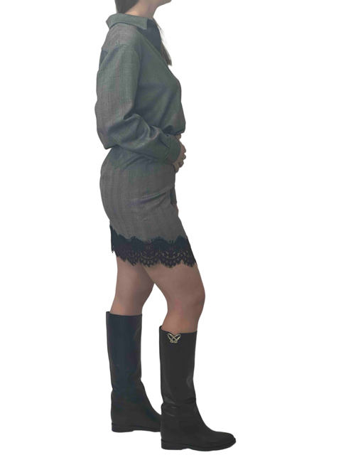 Eleganza e femminilità si uniscono in questo abito corto con top stile camicia e gonna impreziosita da dettagli in pizzo. Un mix perfetto tra linee sartoriali e romanticismo, ideale per look chic e sofisticati.