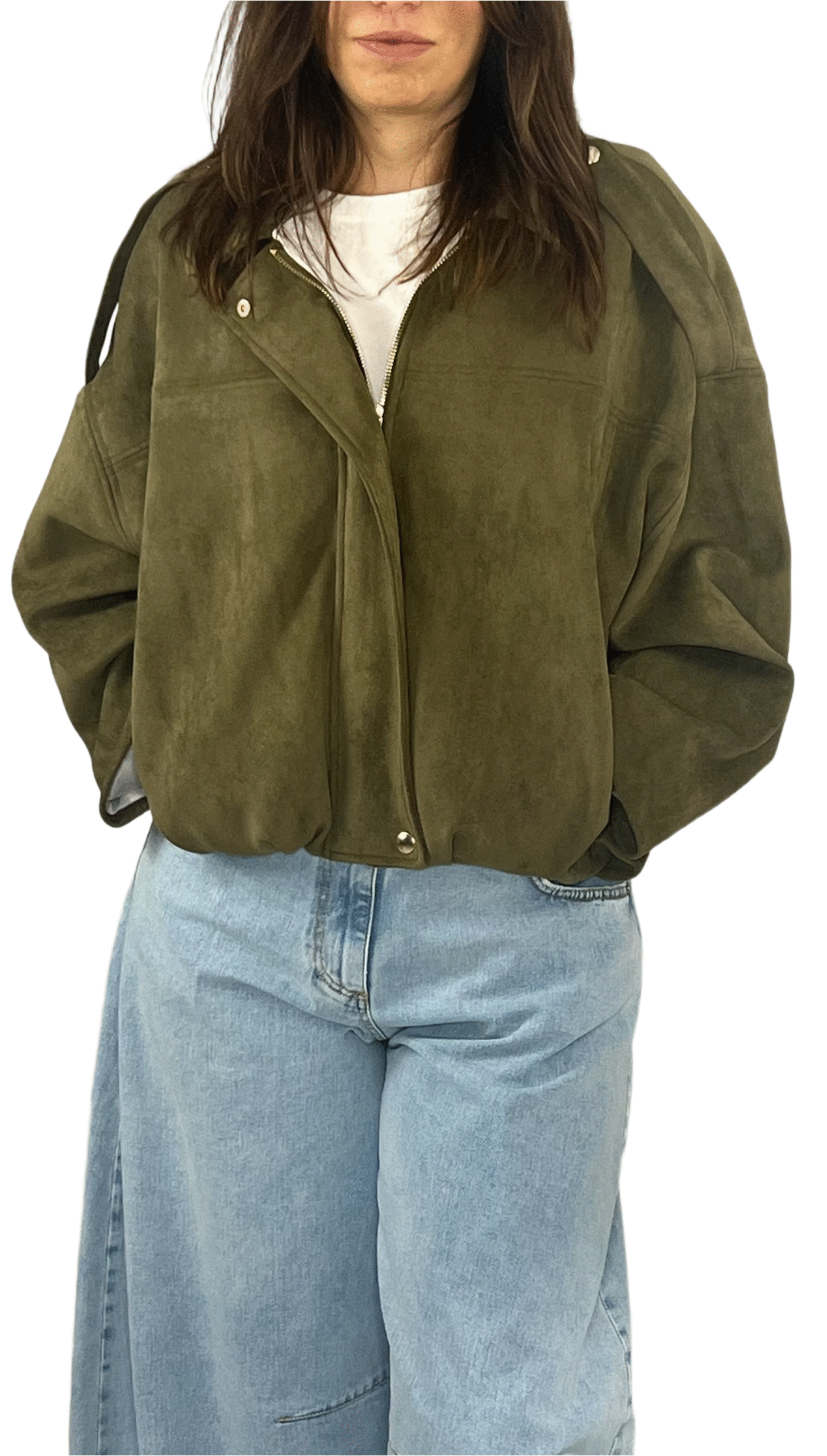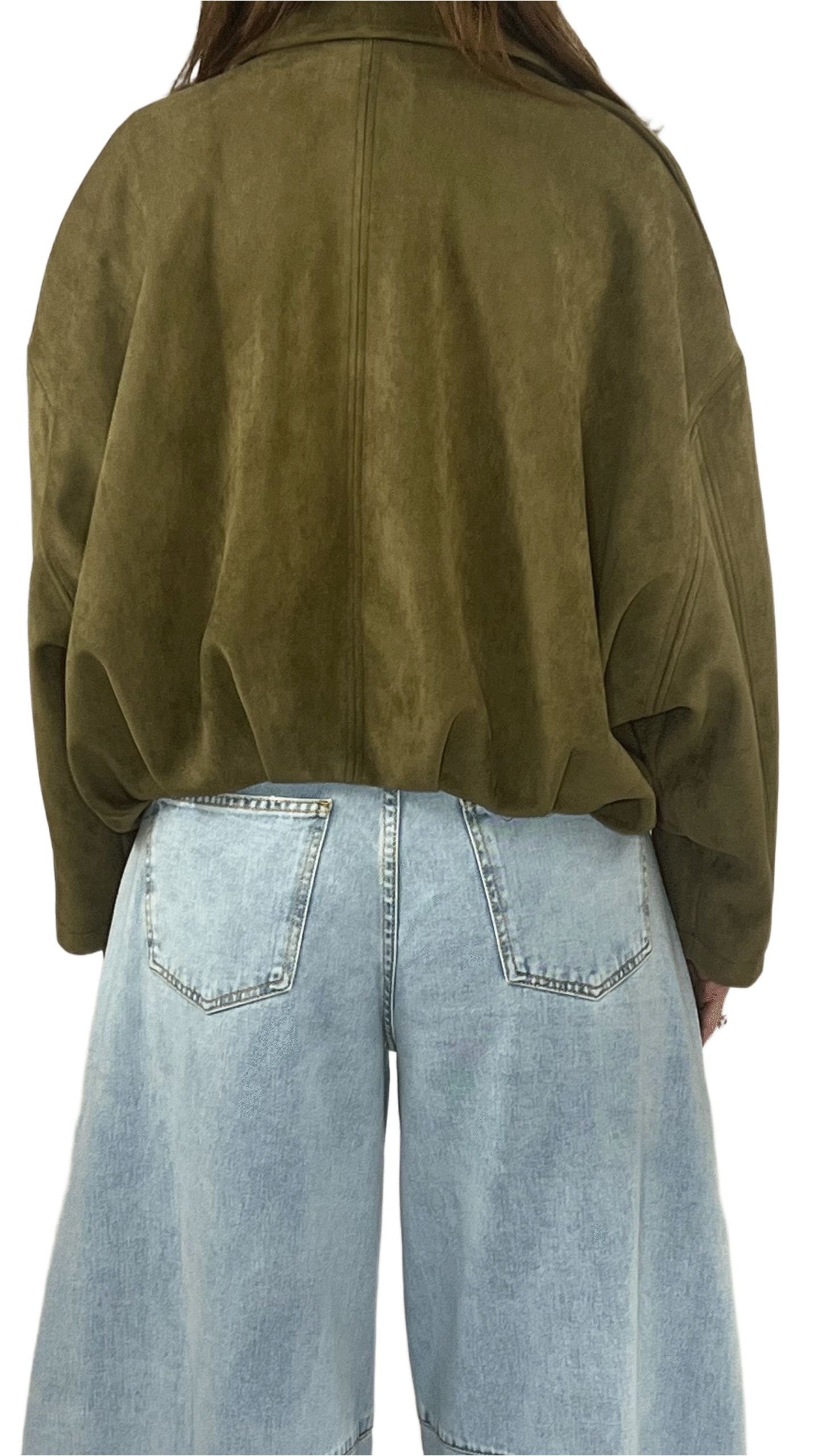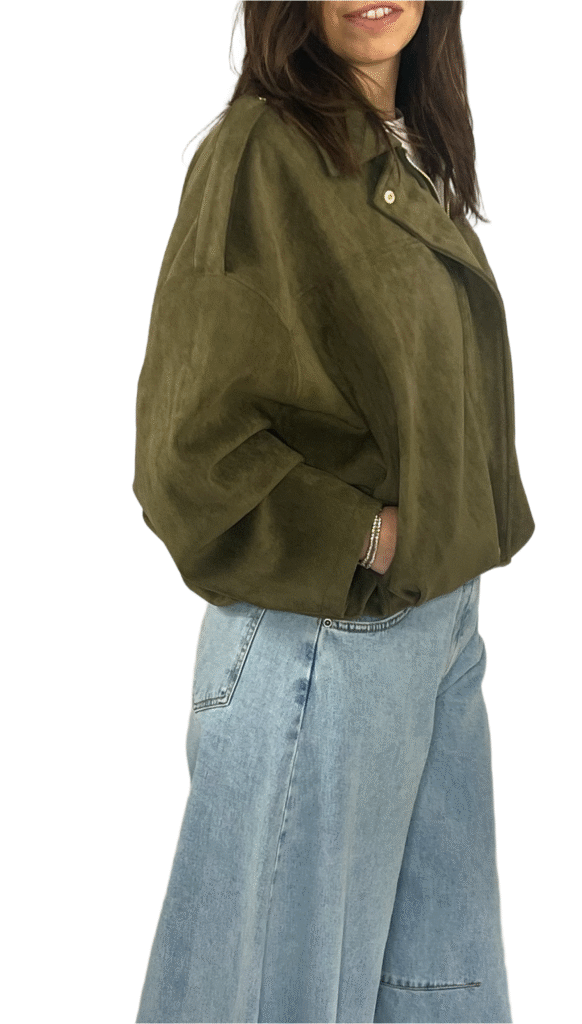 Bomber in suede con chiusura a cerniera e dettaglio arricciato sulla parte posteriore. Design raffinato e linea versatile per outfit di stagione.