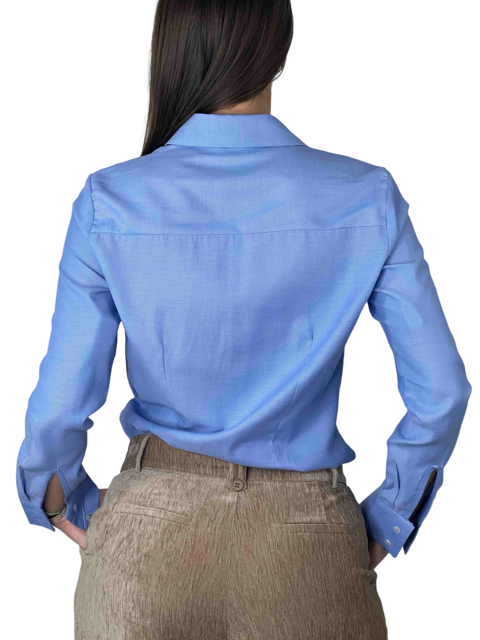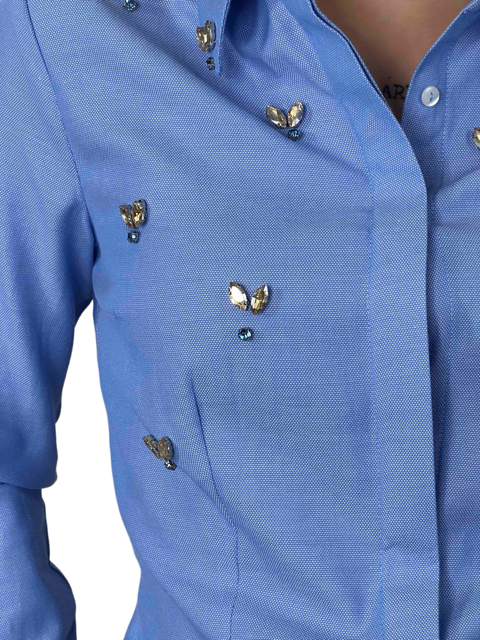 Camicia in puro cotone azzurro dal taglio slim fit, impreziosita da delicati inserti gioiello. Elegante e femminile, perfetta per aggiungere un tocco di luce ai tuoi outfit day-to-night.