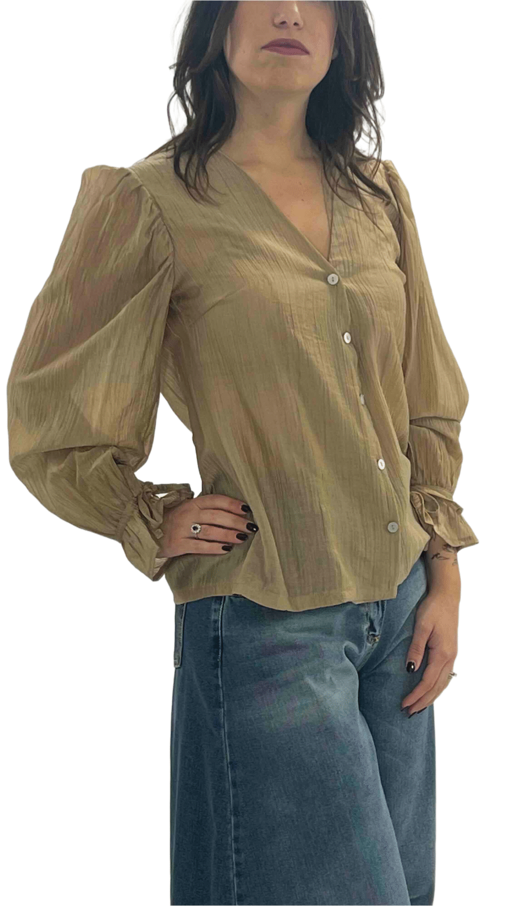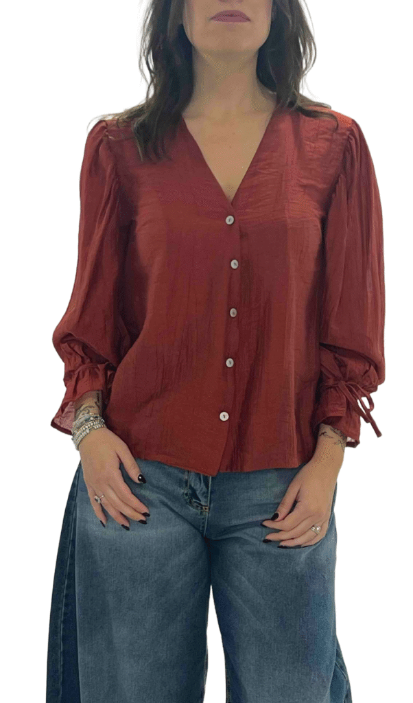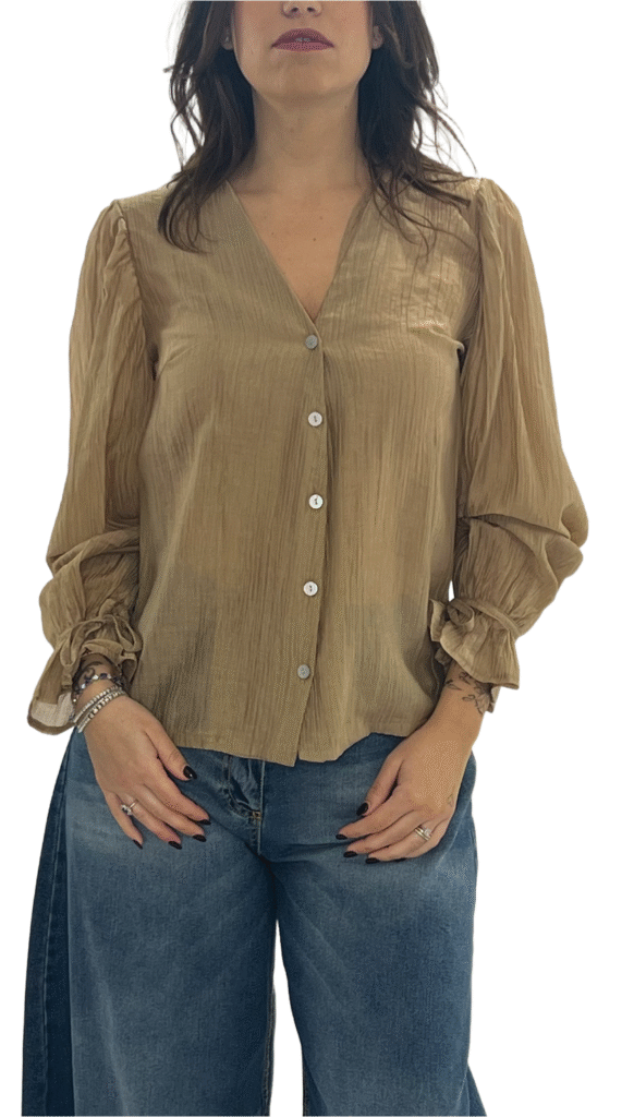 Camicia femminile in morbido tencel, con elegante scollo a V e pratica abbottonatura frontale. Le maniche a tulipano aggiungono un tocco raffinato e leggero, perfetto per un look fresco e versatile, ideale sia per il giorno che per la sera.