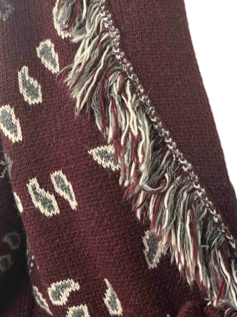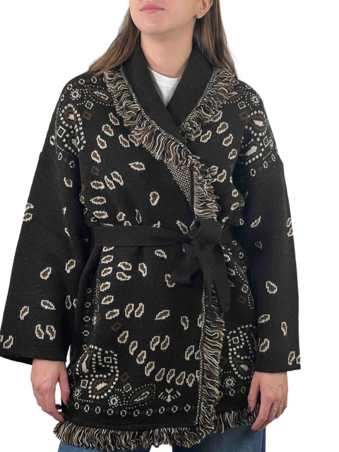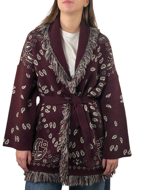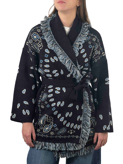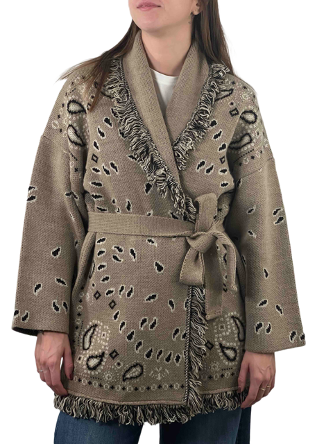 Cardigan in maglia dallo stile boho-chic, ispirato al classico design Alanui. Presenta una stampa bandana all-over, frange decorative e cintura in vita per una vestibilità regolabile. Perfetto per aggiungere un tocco di carattere ai tuoi look casual.