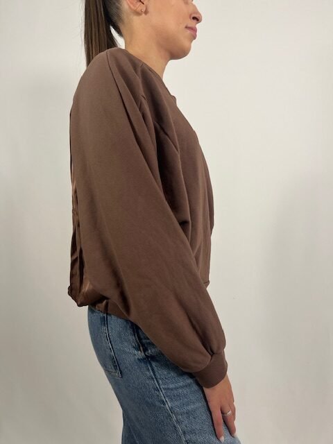 Felpa over corta, dal design moderno, con inserto in viscosa sul retro che dona un tocco fluido e femminile. Perfetta per un look casual ma ricercato.