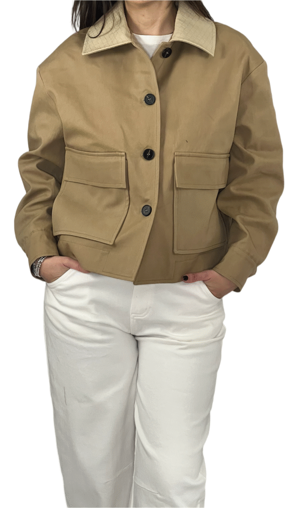Giacca dal design contemporaneo caratterizzata da un pratico tascone frontale e da un raffinato colletto con effetto pelle intrecciata. Il mix tra funzionalità e stile dona al capo un carattere deciso, perfetto per completare outfit casual e urbani con un tocco originale. Confortevole e versatile, è ideale per le mezze stagioni.