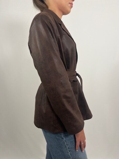Giacca in ecopelle invecchiata da allacciare in vita, dal taglio moderno e grintoso. Un capo versatile, perfetto per look decisi con un tocco vintage.