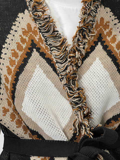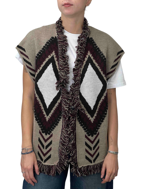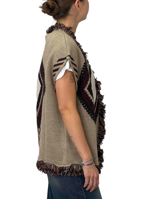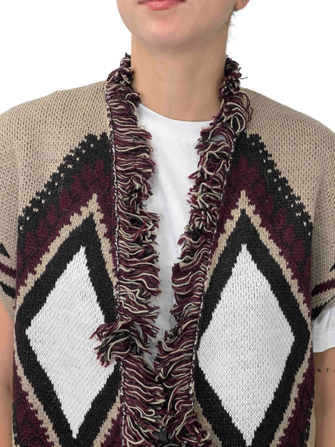 Gilet smanicato in stile Alanui. Caratterizzato da un design jacquard con motivi etnici e frange decorative, unisce stile boho e dettagli artigianali. Perfetto per completare look casual o bohemien con un tocco distintivo.