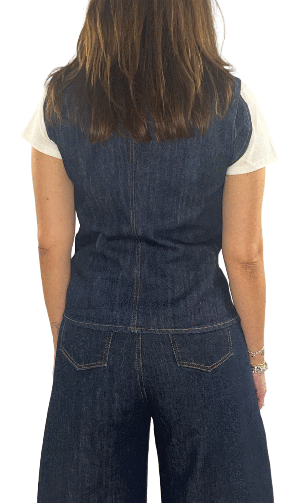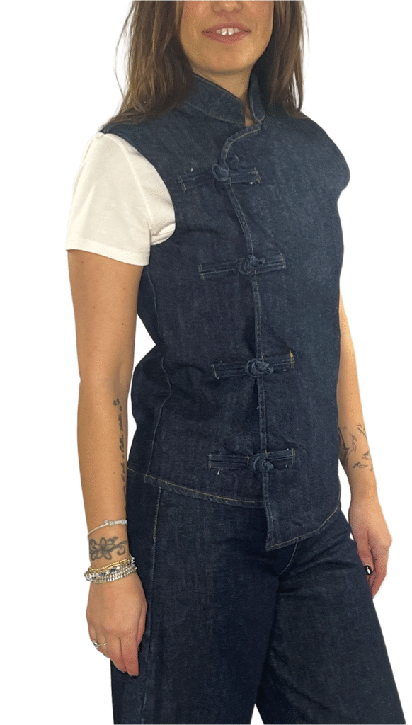 Gilet in denim dal design ricercato, con scollo alla coreana e allacciatura laterale alla napoleone. Ideale per creare look moderni e distintivi.
