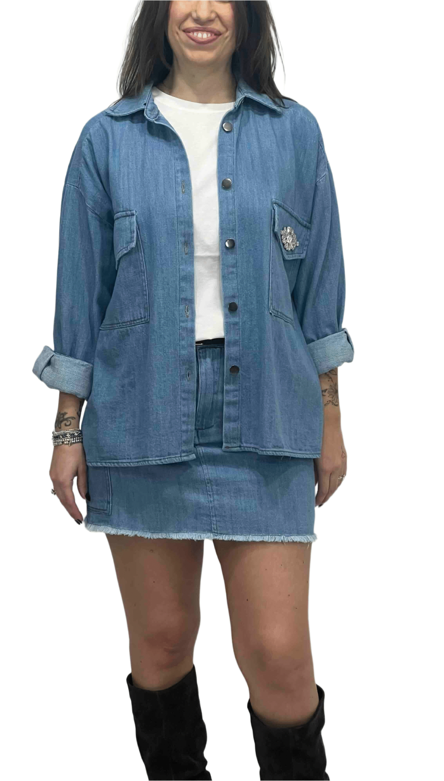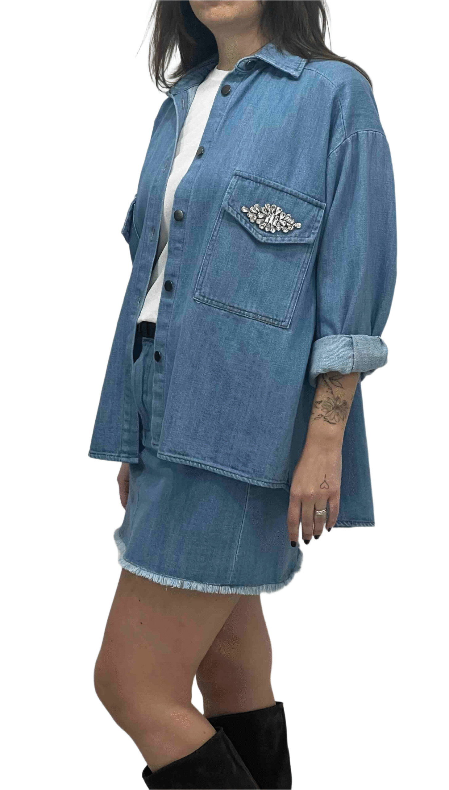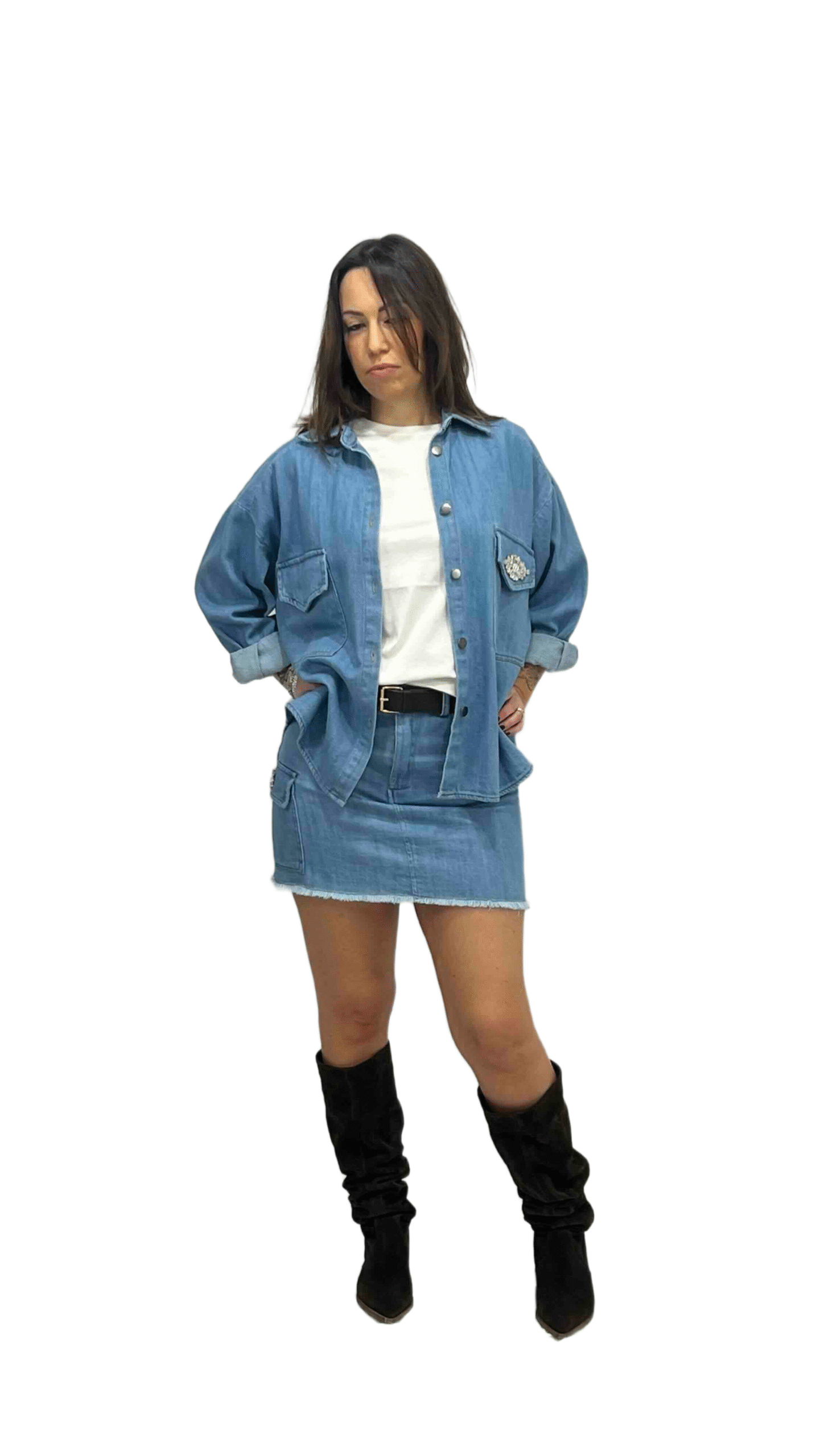Gonna corta in denim con sfrangiatura sul fondo, moderna e di tendenza, ideale per look freschi e originali.