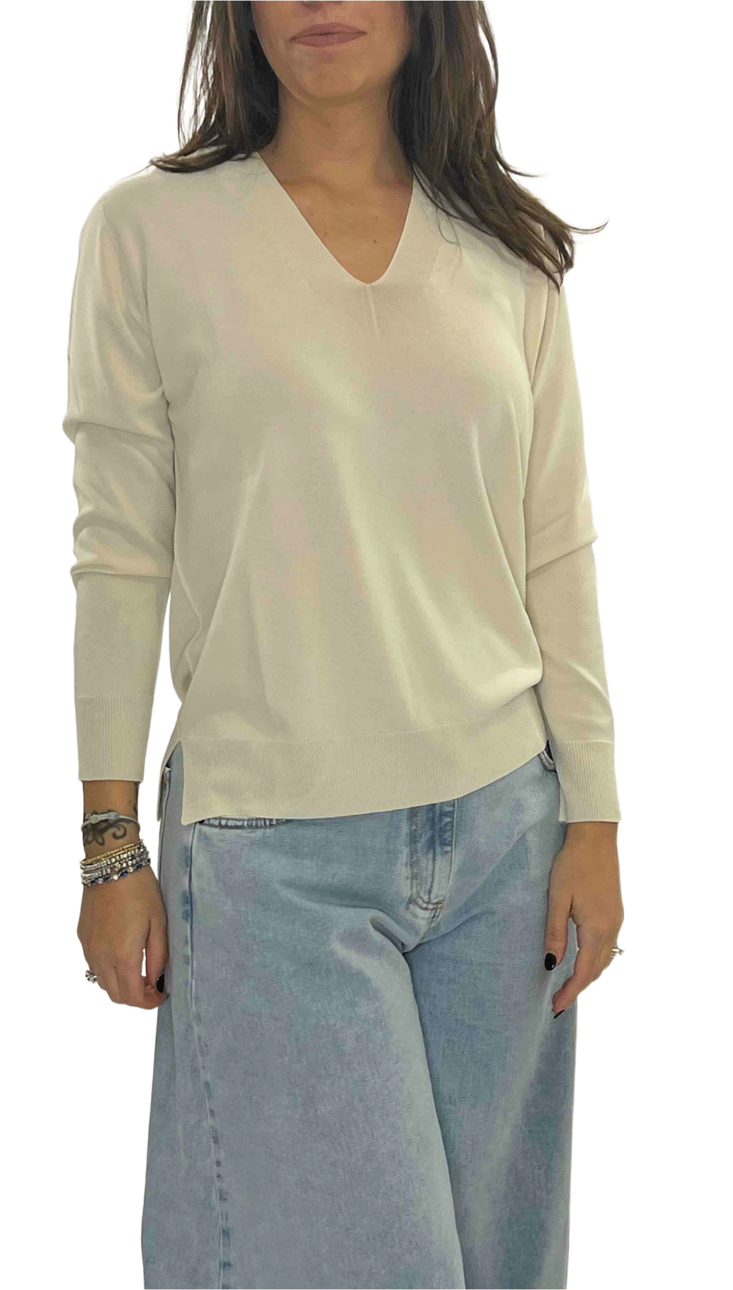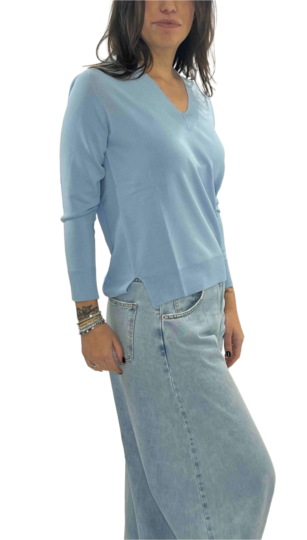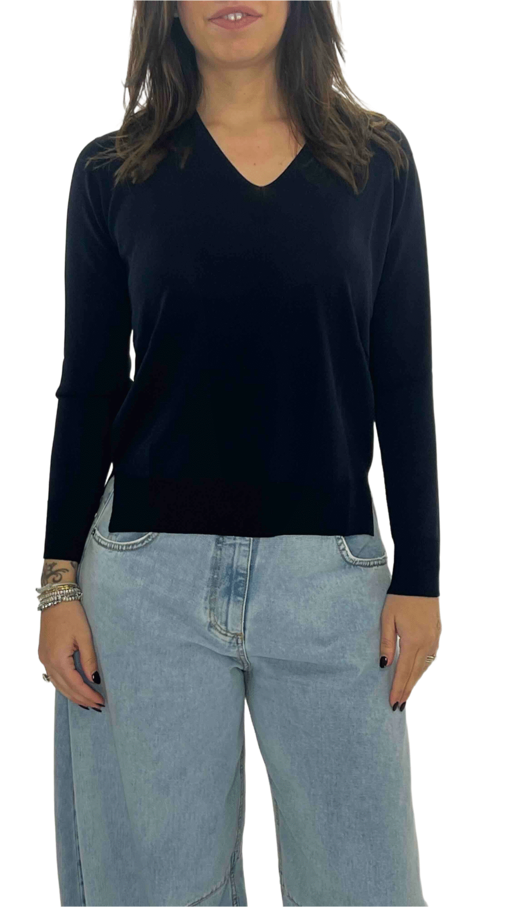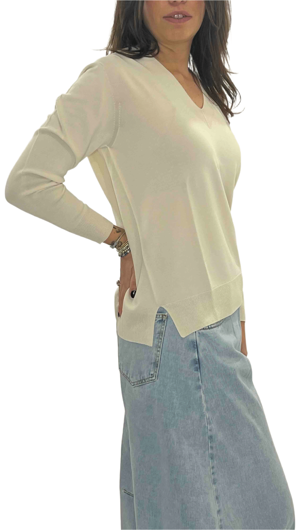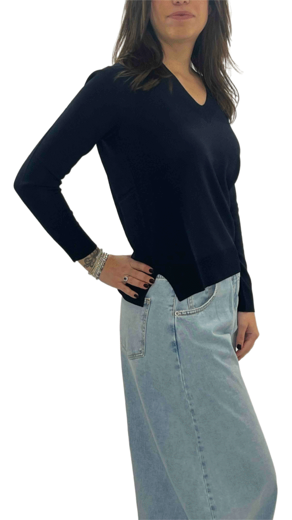 Maglia a scatola in viscosa con scollo a V, dal taglio morbido e contemporaneo. Il design essenziale è valorizzato dagli spacchetti laterali, che donano movimento e una vestibilità confortevole. Perfetta per un look casual chic, facile da abbinare sia a pantaloni che a gonne.
