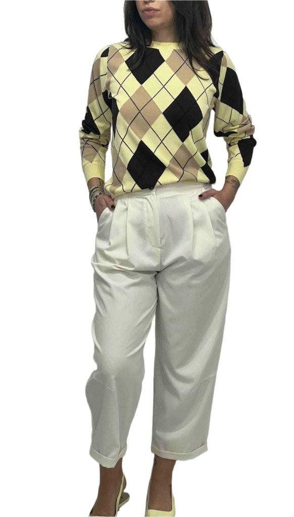Maglia in viscosa leggera con motivo geometrico a rombi, dal design elegante e contemporaneo. La manica lunga la rende perfetta per ogni stagione, offrendo comfort e vestibilità fluida. Ideale da indossare sia da sola che sotto giacche o cardigan per look versatili e raffinati.
