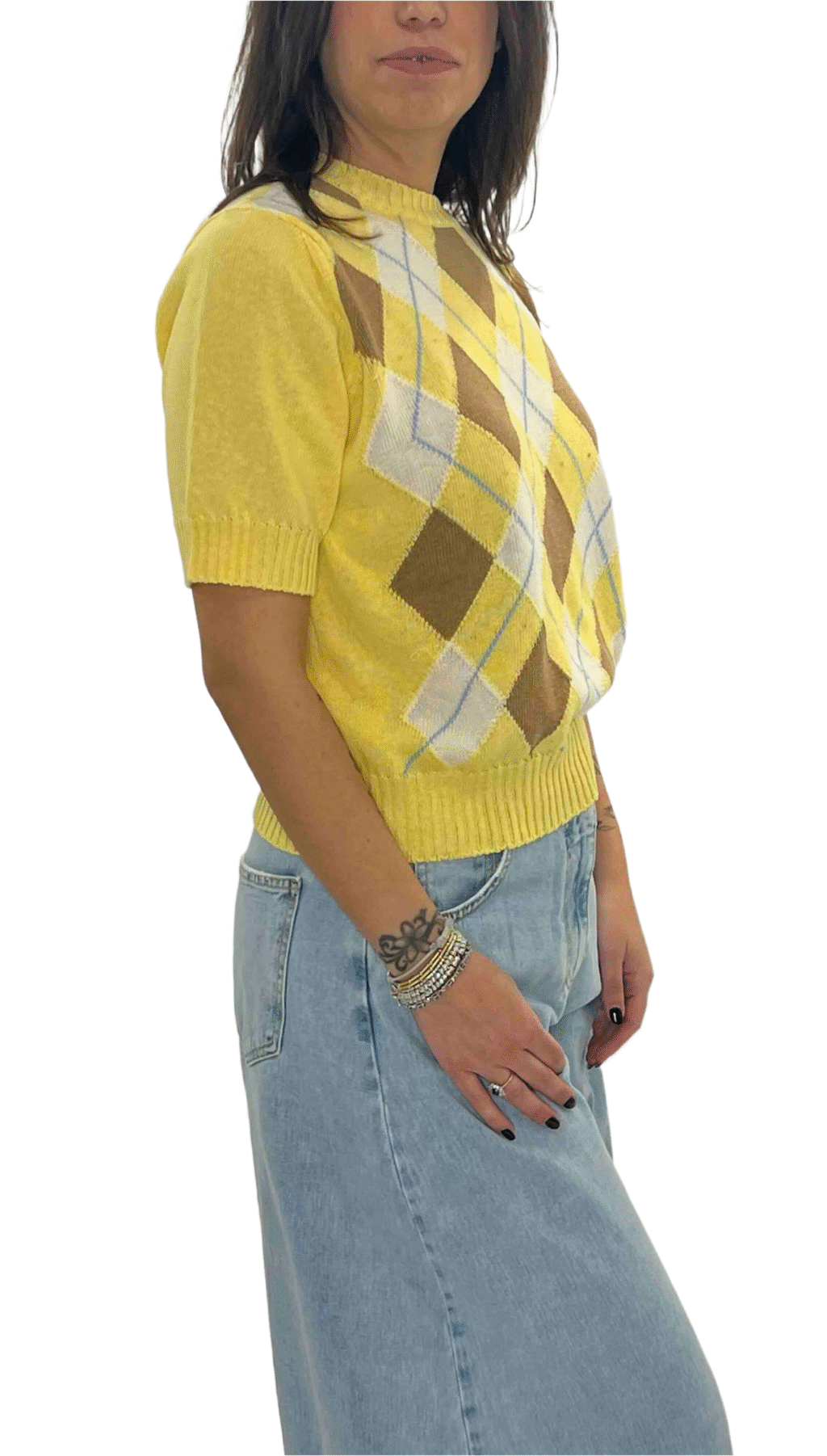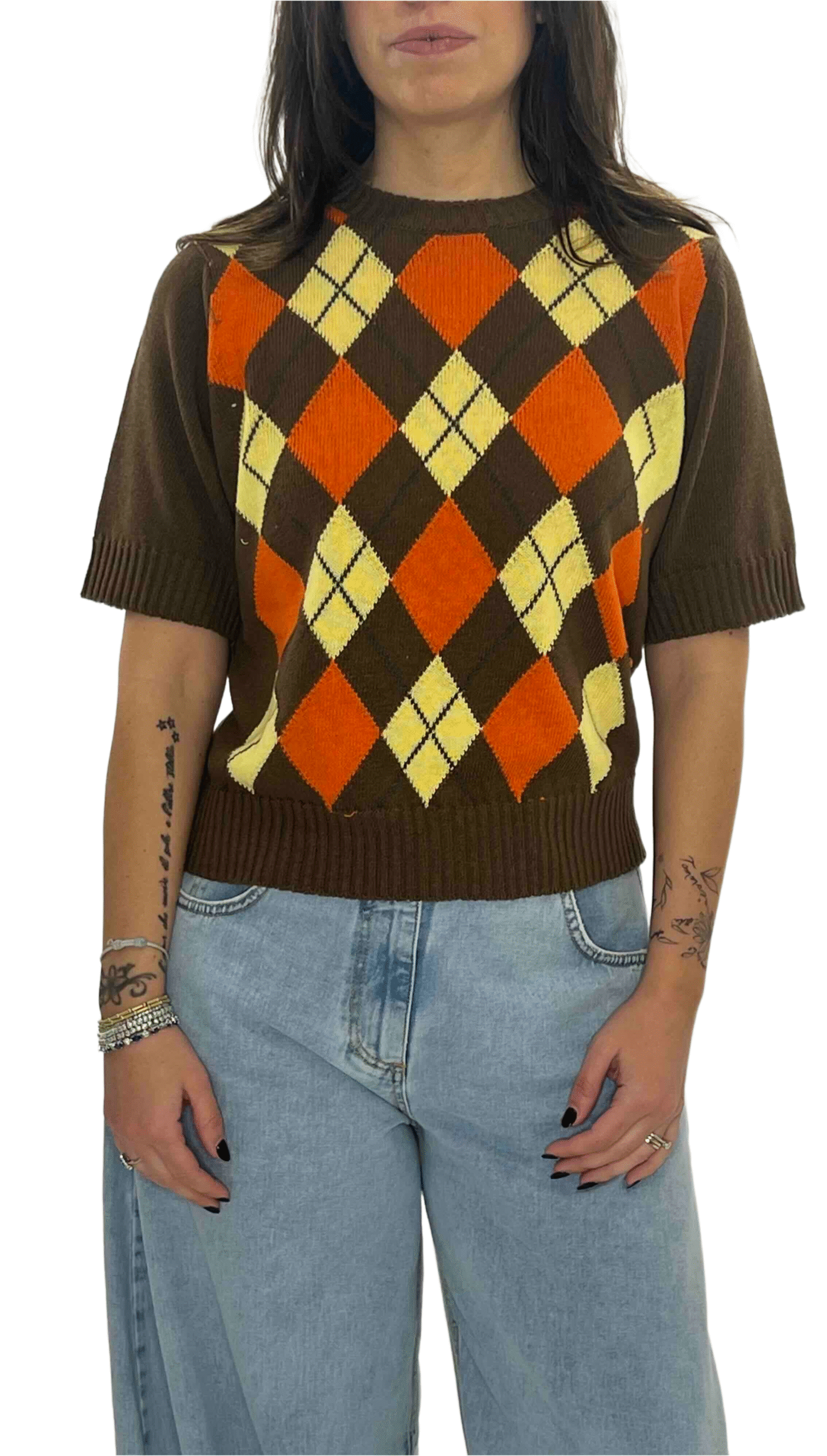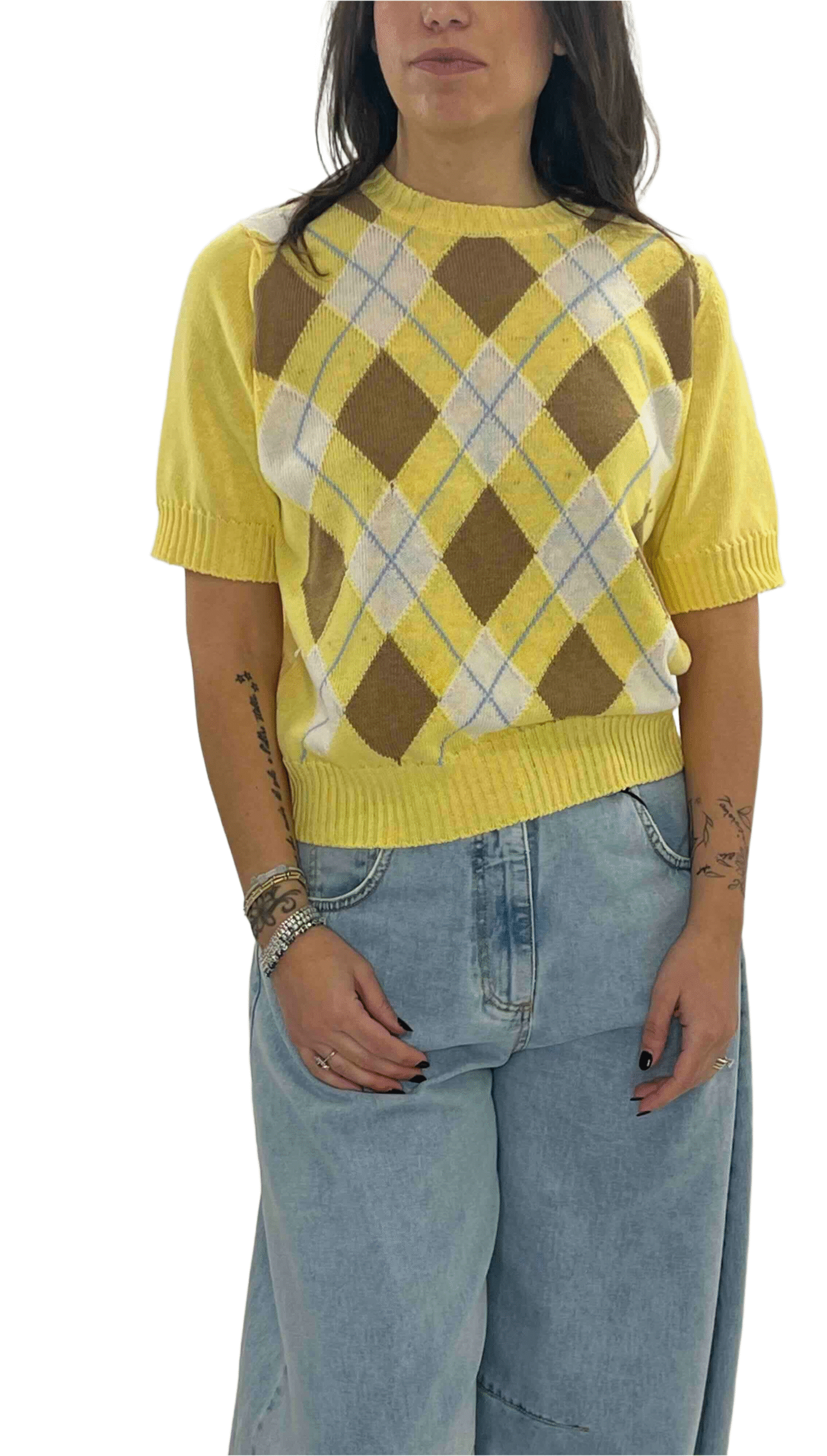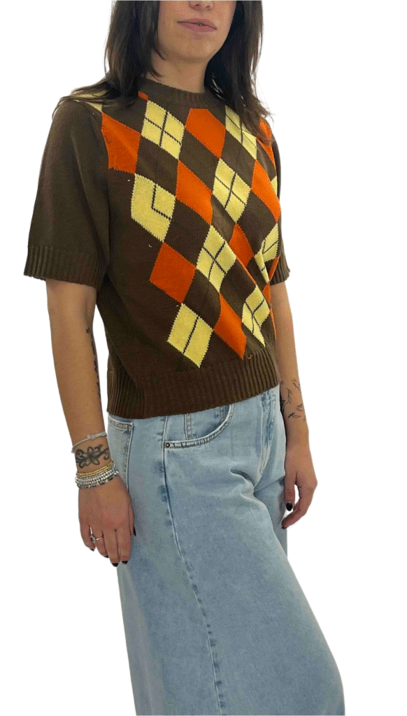 Maglia a rombi a manica corta, dal design moderno e versatile. Perfetta da indossare da sola per un look essenziale oppure come gilet sopra camicie per creare sovrapposizioni di tendenza. Il motivo geometrico dona carattere e rende ogni outfit curato e contemporaneo.