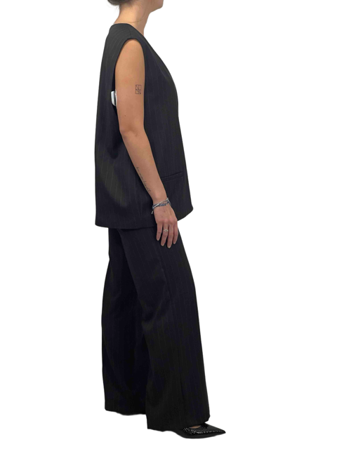 Pantalone palazzo ampio in tessuto gessato, con chiusura frontale a bottone e zip. Dettaglio elasticizzato sul retro per una vestibilità comoda e versatile. Da abbinare al suo gilet over coordinato per un completo elegante ma moderno.