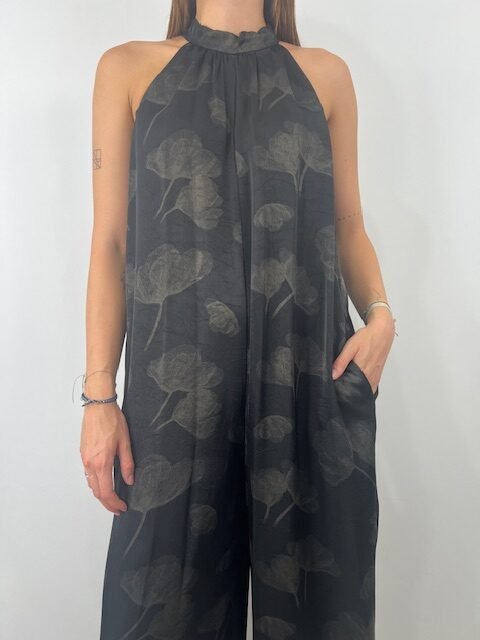 Tuta elegante in fantasia floreale con scollo all’americana, perfetta per un look sofisticato e femminile nelle occasioni speciali.